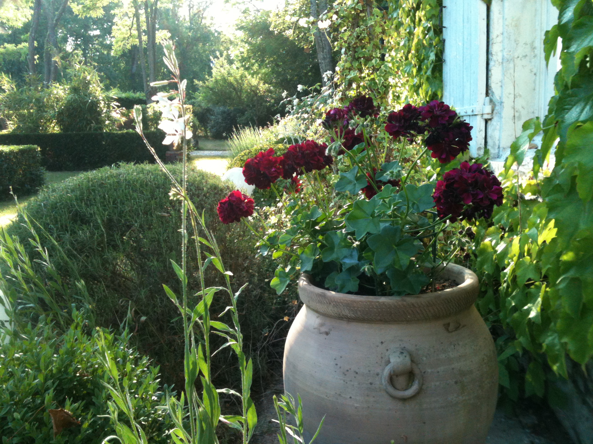 Juin; le plus difficile en juin, c’est de contrôler la pousse des haies, des bordures et des topiaires. L’herbe ressemble encore à un tapis bien vert. Un gravier blanc a rhabillé l’allée, une grosse table en bois à l’ombre des charmes et des acacias, près du garage, apporte du confort. Deux acacias livrés à la tronçonneuse de l’élagueur, côté ouest, et la table est bien éclairée. Un coin agréable sous la canicule inattendue. Autre bonheur, la floraison fin juin du ciste blanc (Cistus laurifolius) au pied du pin. Une belle image méditerranéenne.